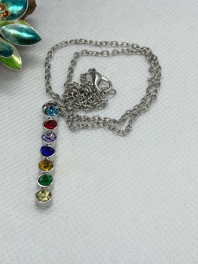 Crystal Chakra necklace with one coloured crystal for each Chakra on silver tone chain.