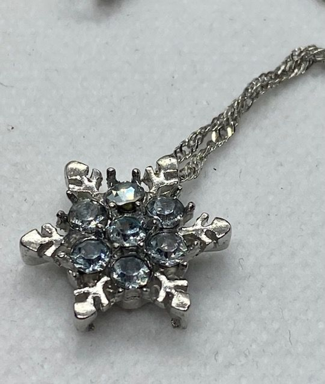 Crystal snowflake necklace on silver tone chain. Pendant has 7 blue crystals.