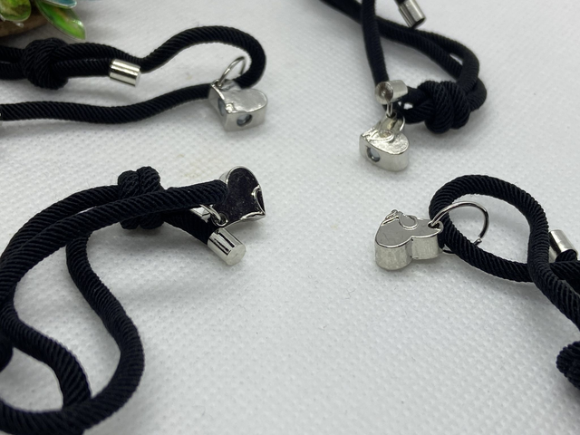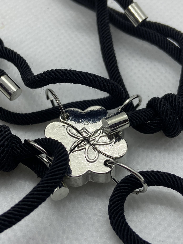 Friendship bracelet set. Four bracelets which each hold a heart charm. Each charm then comes together to make a four leaf clover.