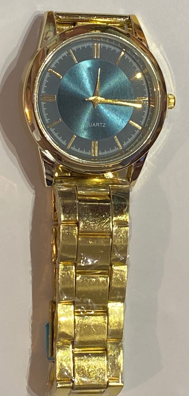 Gold tone watch. Gold tone strap with blue watch face.