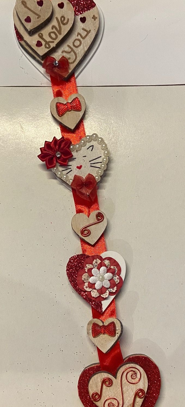 Embellished love hearts on red ribbon with 'I love you'. Please note that these are handmade and each strand will differ. If you would like something specific on your strand, please email with details.