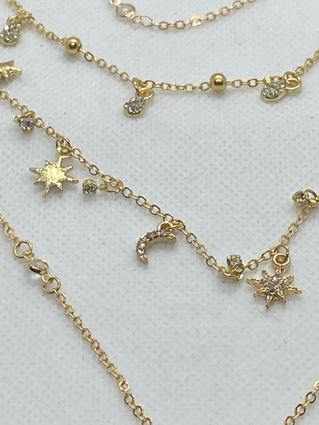 Multi layer gold tone necklace with three layers with crystals, stars and moons.