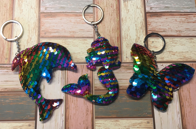 Sequin keyrings. Choose from Green/blue Unicorn, Pink unicorn or multi-coloured mermaid.