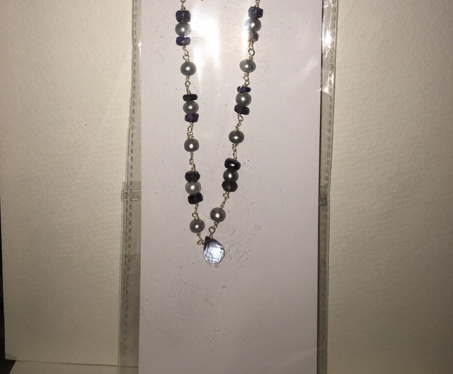Natural gemstone 18" necklace. Necklace is made up of shell Pearl and Iolite natural gemstones and has a cut Iolite crystal pendant.