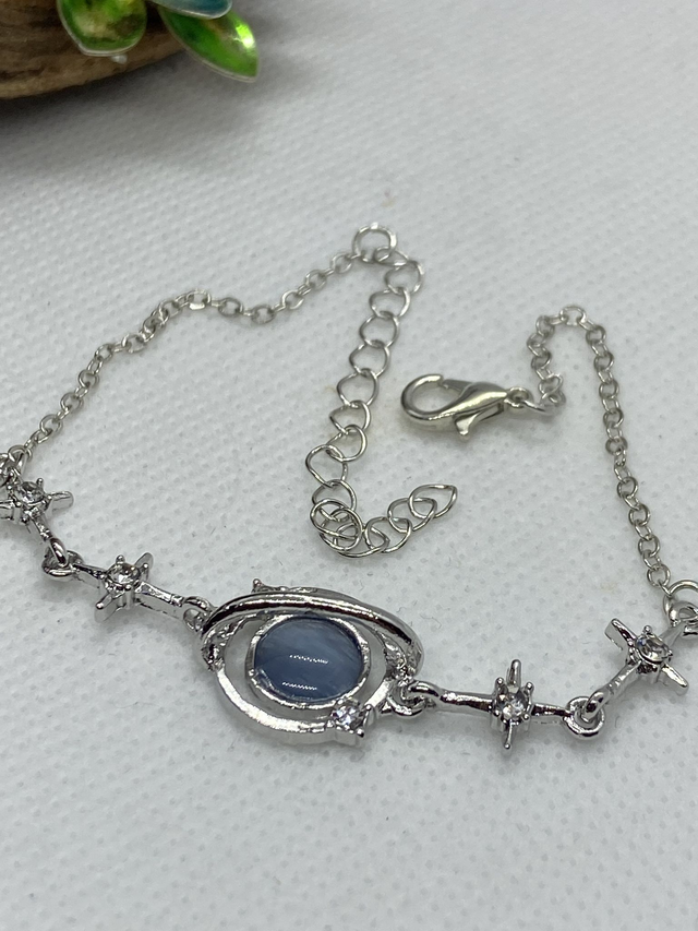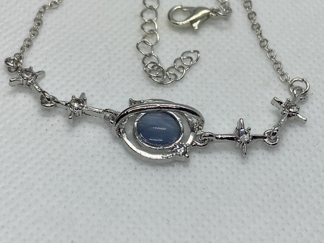 Silver tone bracelet with a blue resin middle with small crystals in the stars along the bracelet. Extender chain for additional length.